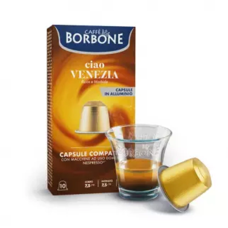 The Nespresso®* compatible Caffè Borbone aluminum capsules of the Ciao Venezia blend are perfect for those who love an espresso with a refined, rich and smooth taste. From the skilful research and crossing of the best Robusta and Arabica, three new blends have been created by Caffè Borbone for those who prefer to enjoy the aroma of true Neapolitan coffee in aluminum capsules. Thanks to the self-protected capsule and the aluminum closure seal, the product keeps all its fragrance intact, for a truly exceptional espresso, in aroma and taste. These capsules are compatible with the Nespresso® System*