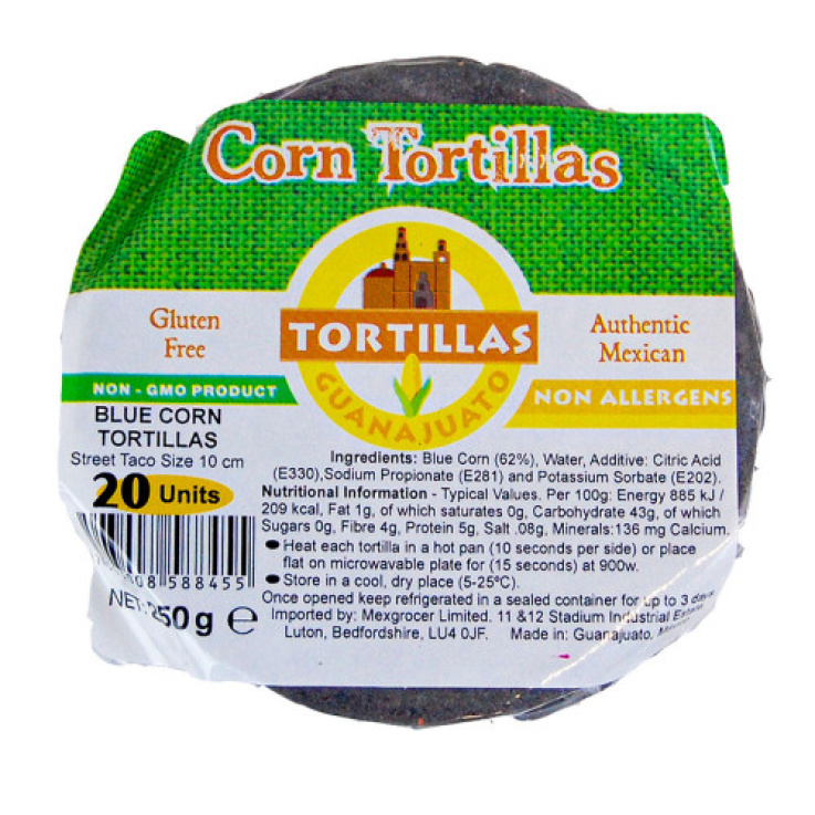 Blue Street Taco Size Corn Tortillas (20 tortillas per pack). Tortillas, originally known as tlaxcalli, have been a stable food for more than a millenia, with the oldest traces of tortillas dating back to 10,000 years ago. Street tacos are very popular for dinner and before or after clubbing. Blue corn is one of the corn varieties that exist in Mexico and has been a staple for more than a millenia. The most popular street tacos are Tacos al Pastor. They are perfect for making tacos, quesadillas, flautas and even tostadas (just fry them to crisp) or bake them for 20 minutes at 180 C.