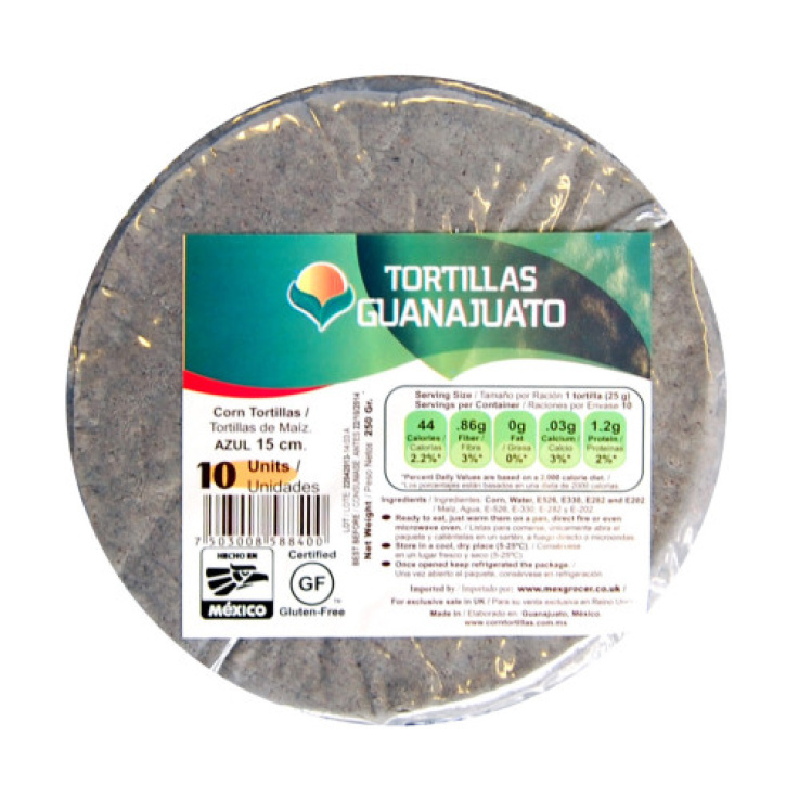 Street Taco Size Corn Tortillas (10 tortillas per pack). Tortillas, originally known as tlaxcalli, have been a stable food for more than a millenia, dating back as far as 10,000 years BCE. Tacos are very popular for lunch or dinner. Blue corn is one of the corn varieties that exist in Mexico and has been a staple for more than a millenia. They are perfect for making tacos, quesadillas, flautas and even tostadas (just fry them to crisp) or bake them for 20 minutes at 180 C. Tortillas can be used to prepare assorted types of tacos, such as regular tacos, golden tacos (fried until crispy), flautas (flutes rolled taquitos, looking like thin flutes). When cut into triangles and fried they become totopos (tortilla chips) to prepare chilaquiles with sauce or just to be dipped in cheese or guacamole. When cut in stripes, they are used to make tortilla soup; a delicious hot soup with a zingy flavour to chipotle. Heat on a dry hot plate for 10 seconds per side. If it’s too dry, spray with water or add a little oil.