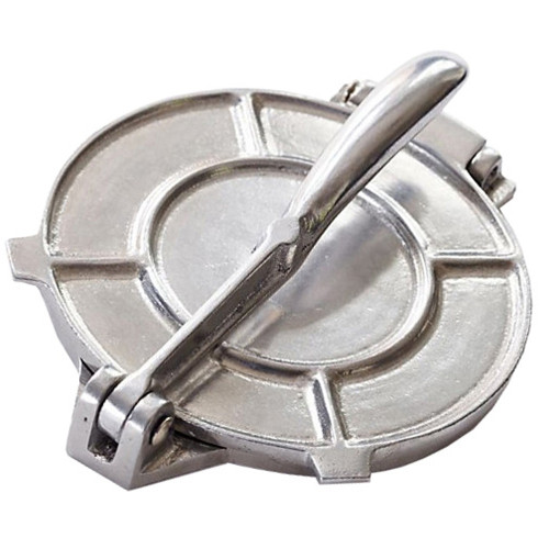 Tortilla presses made of aluminium, are especially designed to make authentic corn flours in the artisan way; this press is for extra large tortillas. Each press comes with a plastic sheet that must be placed between the 2 walls, as the dough must not touch the metal. Rinse with hot water and dry thoroughly prior to initial use. After use, the press should be relatively clean, and a wipe down with a dry towel should suffice. If that is not enough, clean immediately with hot water and a brush. Rinse and dry thoroughly.