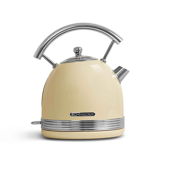 Pour sa nouvelle gamme de petit électroménager, Schneider lance la collection « Feeling’s » rendant hommage aux années 50. Intégrée dans cette série, la bouilloire vintage 1,7 L 2200 W SCKE17CR crème Schneider a été designée pour apporter une touche visuelle soignée dans votre cuisine : forme arrondie, finitions chromées et coloris beige vintage, votre plan de travail profitera d’un atout esthétique travaillé.