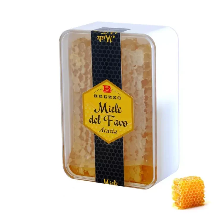 Acacia Honey Honeycomb 200 g from Brezzo is a unique product that allows you to enjoy honey in its most natural and authentic form. The honeycomb, composed of hexagonal wax cells built by the bees, is carefully collected by the beekeeper. The honeycomb is presented in its intact and authentic form, without being centrifuged, allowing you to enjoy the honey as it is inside the cells. Each plastic tray contains a section of honeycomb, which you can enjoy in its entirety in a practical and easy way. The wax is completely edible and delicious to chew. It does not alter the sweet and delicate taste of acacia honey, but rather enriches the sensory experience. Acacia Honeycomb Honey is perfect for those seeking genuine, natural honey in its purest form.