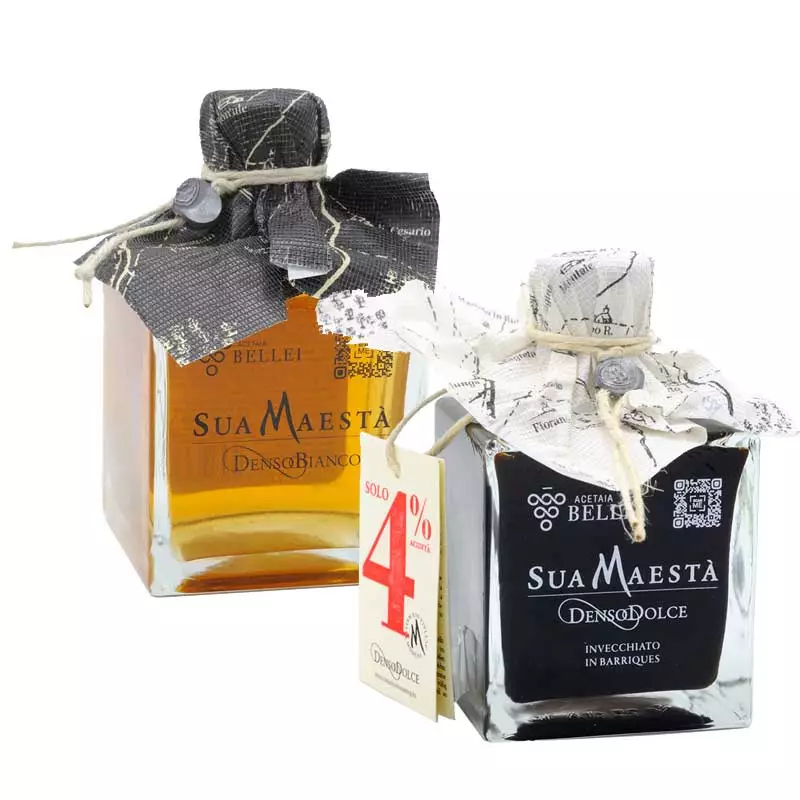 Discover Sua Maestà condiments by Acetaia Bellei in this unique set which includes both Sua Maesta Denso Dolce with Balsamic Vinegar of Modena IGP and Sua Maestà Denso Bianco. Two great excellences in the world of Italian gourmet condiments.