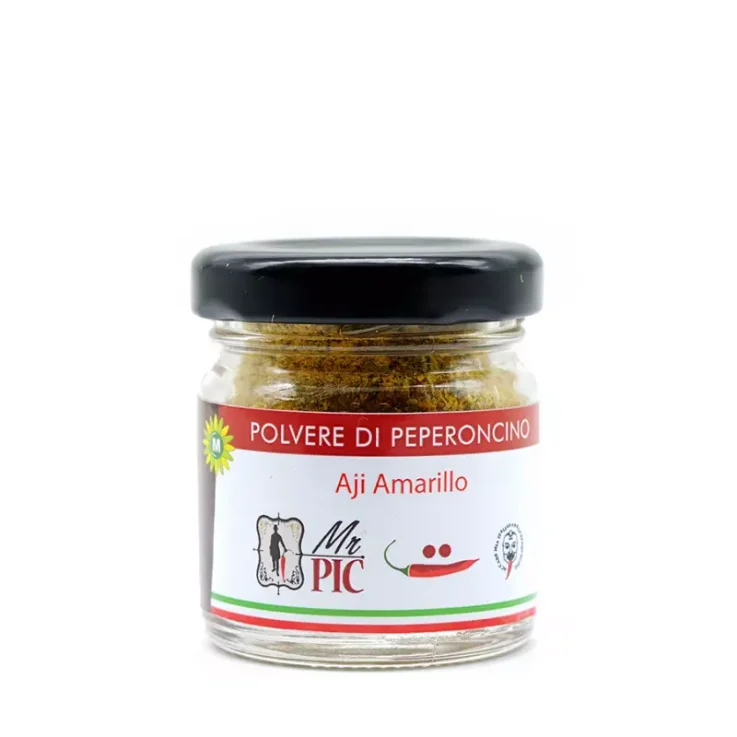 It is a medium-spicy chili powder that can be added to sauces, bread and pasta dough or used as a seasoning spice. Aji Amarillo is a chili pepper native of Peru. It has an elongated shape and is very aromatic. It is consumed in various stages of maturation: green, golden or orange.