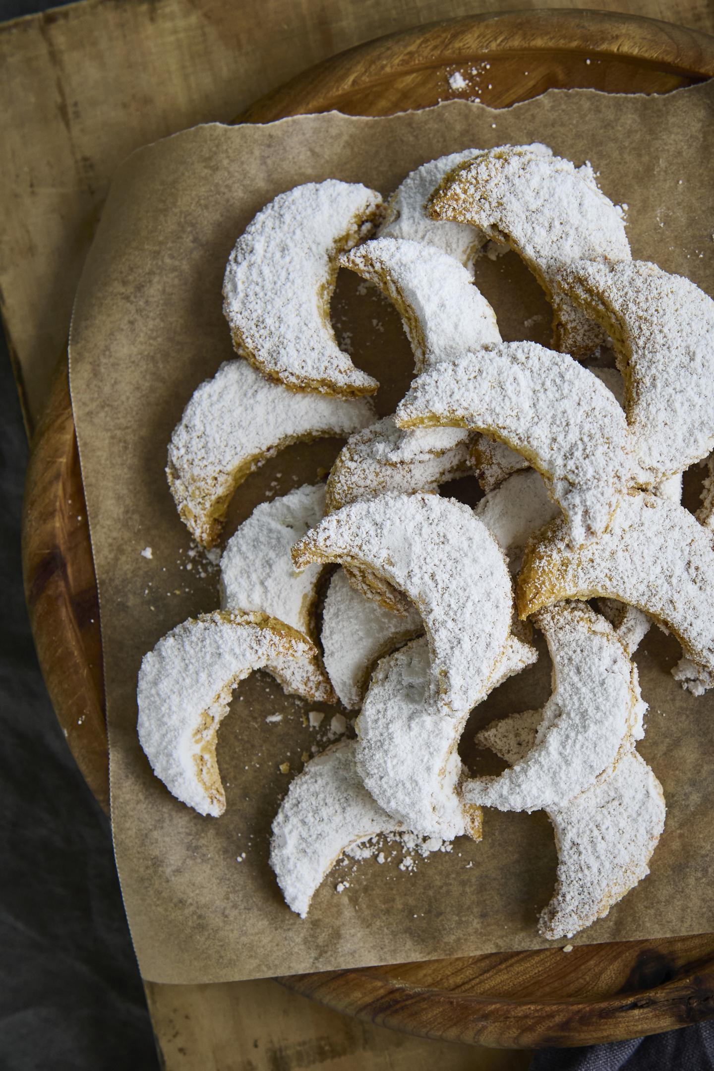 My mother’s Almond Moon Biscuits use a recipe that has been handed around from sister to sister-in-law for a few generations now. The ‘recipe’ has always simply been a list of ingredients that seems to be measured largely in espresso coffee cup portions. The technique was never written down and something you just kept in your memory, using the feel of the dough as a guide for how the recipe is going.
