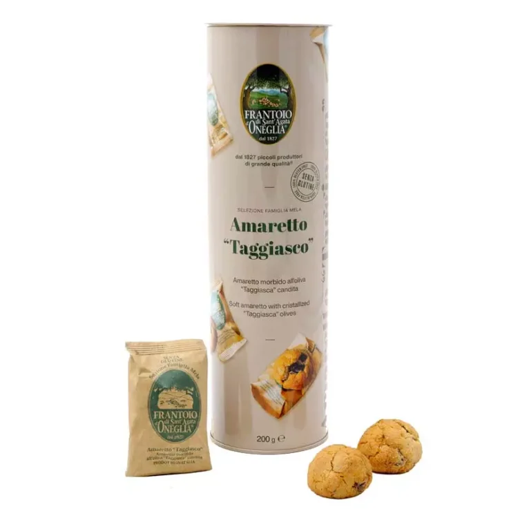 The Amaretto Taggiasco from Frantoio di Sant’Agata d’Oneglia combines the unique taste of the almond paste typical of the classic Amaretto biscuit with the sweetness of the candied Taggiasca olive, for a combination of flavors that will delight your palate. The original tube packaging also makes it an excellent gourmet gift idea for any occasion and for everybody, since it is also a gluten-free product.