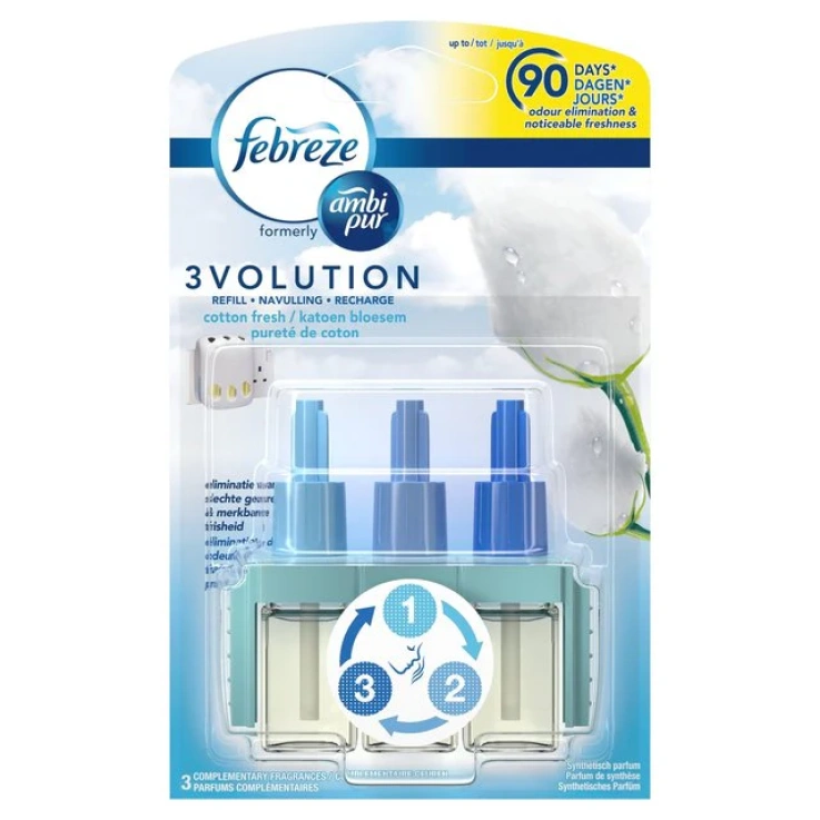 Continuously removes odours and alternates between 3 complementary scents for noticeable freshness, Lasts up to 90 days (if used 12h per day at low setting), Infinity Cotton with 2X Effect: a boosted scent that travels further, Inspired by the freshness of pure white cotton, 3Volution with Odourclear Technology continuously removes odours, leaving a light fresh scent, 3Volution alternates the complementary scents every 45 minutes so you keep noticing the freshness