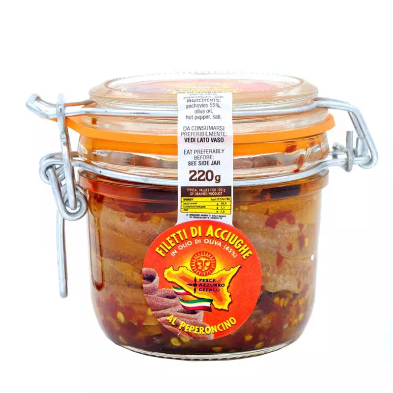 Anchovy fillets in olive oil with Chilli Pepper by Pesce Azzurro Cefalù in airtight glass jar are ideal for those who love spicy and strong flavors. Try them on pizza or to guarnish summer salads. They combine the unique taste of Pesce Azzurro anchovies with the convenience of everyday use, thanks to the hermetic closure of the glass jar that preserves the original flavor of the product intact day after day. Pesce Azzurro anchoviea are rigorously fished and selected in our seas (FAO fishing area 37) and are always filleted and potted by hand according to the ancient Sicilian tradition. The company’s production processes are based on values ​​such as strict quality control of the products used, love for the sea and the consequent respect for fishing cycles.