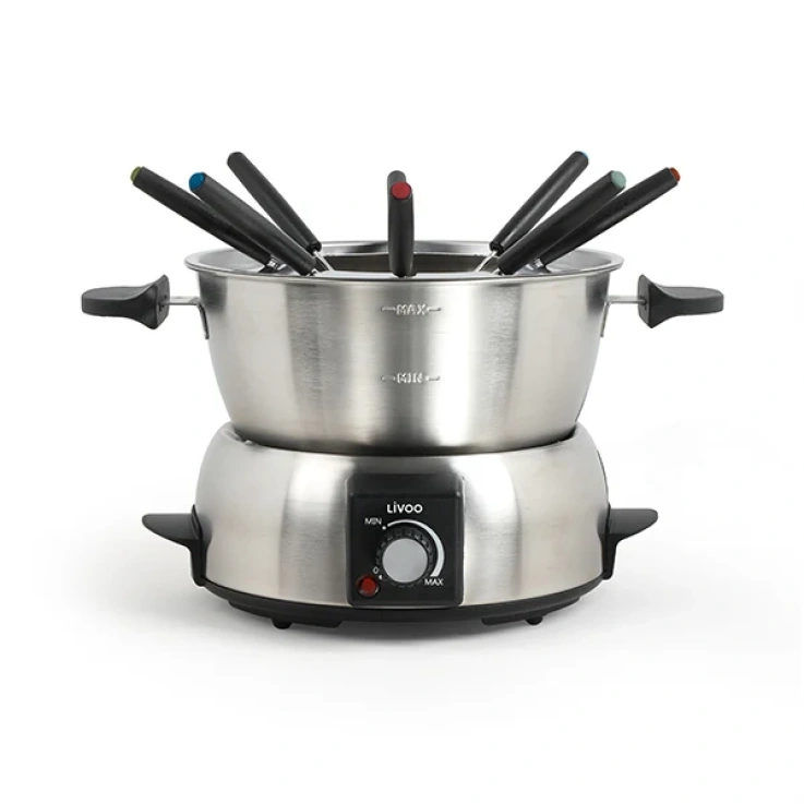 Outre sa grande capacité (1,8 L) l’appareil à fondue électrique Livoo présente de nombreuses fonctionnalités pratiques : range-câble intégré, pieds antidérapants, marquage couleur pour reconnaître les fourchettes, collerette antiéclaboussures en acier inoxydable, poignées de transport.