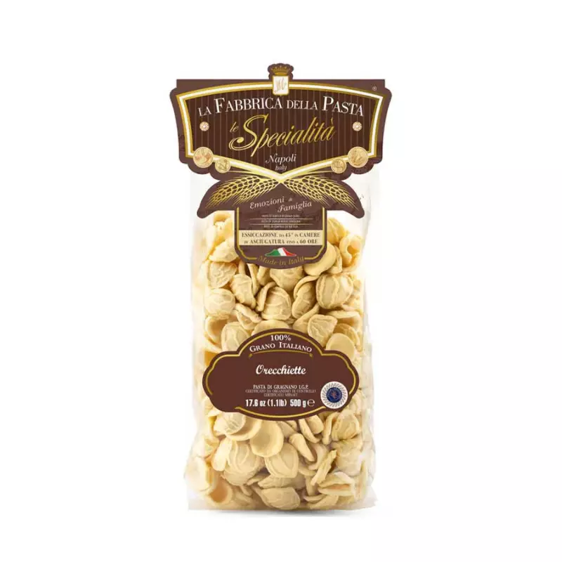 The Artisan Orecchiette from Fabbrica della Pasta are the classic pasta format of the Apulian tradition, in the shape of small ears, with thick veins on the surface. A pasta that lends itself to a thousand preparations, it can be tasted in accordance with the Apulian tradition with turnip tops, or Calabrian with broccoli, always embellished with a drizzle of extra virgin olive oil.