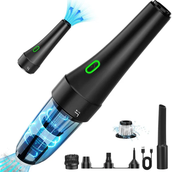 Avec cet aspirateur sans fil portable, vous n’êtes plus limité par les fils électriques. Nettoyez votre voiture, votre bureau et vos pièces à 360 degrés sans obstacle, en vous déplaçant facilement d’une pièce à l’autre.Deux modes de nettoyage et chargement Type-C Mode basse vitesse: 6000Pa pour les poussières fines, Mode haute vitesse: 8500Pa pour les débris plus gros. Ce modèle est 50% plus performant que les aspirateurs portables comparables de même taille. Avec une batterie lithium-ion de haute qualité de 6000 mAh, il se recharge rapidement en 3 à 4 heures via le port Type-C. Indicateur de niveau de batterie: Voyant vert : batterie suffisante. Voyant rouge : batterie faible.Deux buses de nettoyage pour un nettoyage facile des angles morts : Avec ses buses de nettoyage, vous pouvez nettoyer facilement les fissures de votre siège de voiture, le fond de votre voiture et toutes les zones difficiles à atteindre. Cet aspirateur portable peut être utilisé en conditions humides et sèches pour éliminer facilement la poussière, les miettes, les poils d’animaux, les déversements de lait et les liquides. Simplifiant ainsi votre travail de nettoyage.Sa structure spéciale permet de ranger facilement les sacs de rangement sous vide. Livré avec trois buses de gonflage pour gonfler des lits d’appoint, des jouets gonflables, des bouées de piscine, etc. Il n’est plus nécessaire d’apporter une pompe à air pour vos sorties en camping ou à la plage. Attention : Selon l’objet à gonfler, choisissez le bon adaptateur parmi ces trois, et insérez-le à l’arrière de l’aspirateur !!! Ensuite, utilisez la fonction de gonflage.Le filtre HEPA en acier inoxydable 304 peut être nettoyé et réutilisé à l’infini, ce qui élimine le besoin de le remplacer. Avec un grandbac à poussière transparent de 300 ml et une plaque de ressort pour empêcher les débris de tomber, l’aspirateur portable s’éteint automatiquement en cas de blocage pour protéger le moteur. Notez que l’aspirateur ne doit pas être immergé dans l’eau lors du nettoyage du bac à poussière et du filtre, il suffit de les essuyer avec un chiffon humide.