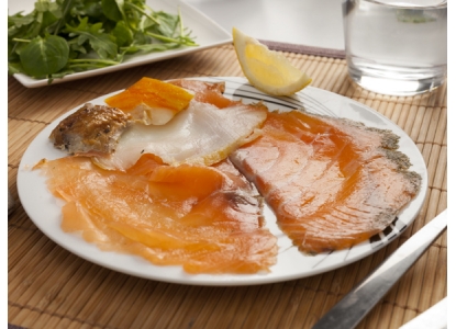 Mélange de notre savoir faire comprenant: 1 tranche de saumon fumé, 1 tranche de gravelax (saumon mariné à l’Aneth), 1 tranche de flétan fumé, 1 morceau de haddock fumé, 1 morceau de maquereau fumé au poivre.