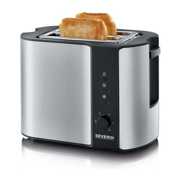 Grille-pain – design de qualité inox – 2 fentes pour 2 tranches : griller, dégeler et réchauffer – réglage électronique du temps de cuisson avec capteur de température – 800 W – touche d’éjection – Fonction décongélation avec voyant lumineux – Range câble