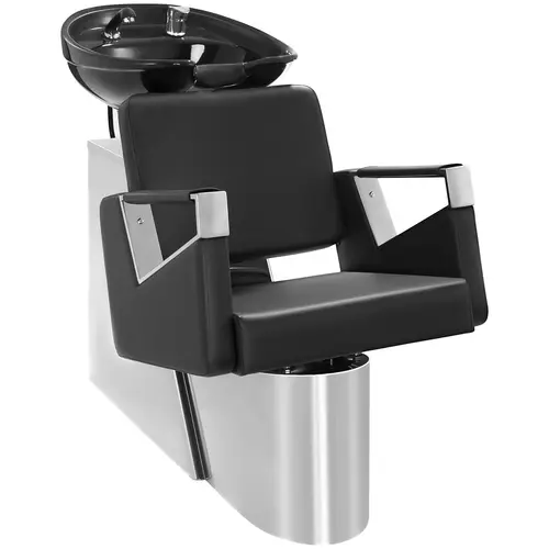 La structure de haute qualité en acier est chromée et permet de relier élégamment le bac à shampoing à votre fauteuil de coiffure. Les éléments et composants du bac à shampoing peuvent être arrangés de sorte que le client soit allongé de manière détendue. Le dossier de 6 cm d’épaisseur peut être ajusté et dispose d’une surface d’assise indéformable en mousse plastique de qualité, laquelle est revêtue d’une couche de cuir écologique. De plus, le bac à shampoing peut être incliné jusqu’à 30° et s’aligne parfaitement dans la continuité du dossier. Les bras métalliques chromés avec accoudoirs en cuir s’accordent parfaitement avec le design moderne du bac à shampoing et octroient un confort supplémentaire pendant le lavage de cheveux.