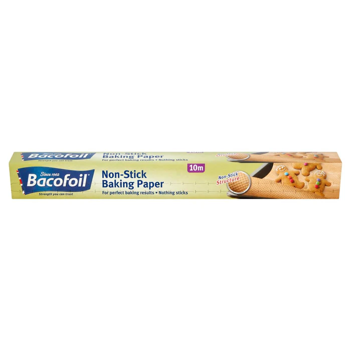 Have no fear bakers; cake mess and cookie disasters are a thing of the past, with Bacofoil® The Non-Stick Baking Paper. The innovative and unique Non-Stick, textured surface reduces the amount of contact with the bake, meaning that everything from cookies, cakes and doughs will bake evenly and slide effortlessly off of the paper – a perfect bake every time. Furthermore, because both sides of the paper are Non-Stick, any excess grease is unable to seep through. The roll is 38cm wide and 10m long so perfect for both small and larger bakes. With Non-Stick Surface, Perfect for all types of baking, nothing sticks, no need to grease the tin, Non-stick on both sides, less mess & less washing up, Unbleached and compostable paper, Made from responsible sources, Suitable for use in conventional, combination and microwave ovens.