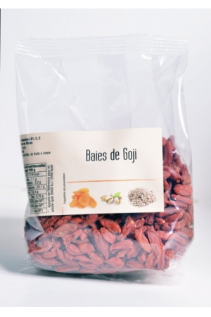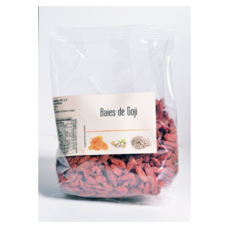 • Ingrédients : Baies de Goji séchées. Riche en vitamines B1, C, E et en fibres. Valeur énergétiques et nutritionnelles moyennes pour 100g: Energie: 1 336 kJ/316 kcal Matières grasses 2,7g dont acides gras saturés 0,3g. Glucides 53,9g dont sucres 53,1g Fibres alimentaires: 12,4g Protéines: 13,0g Sel: 0,76g