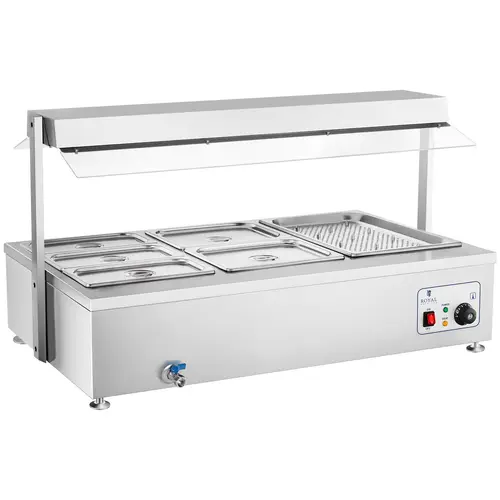 Ce Bain Marie 2900 W de grande qualité de Royal Catering est adapté à une utilisation professionnelle dans les buffets de restauration, cafétérias, hôtels et de nombreux événements au service de la clientèle. Grâce à la protection anti éclaboussures et la lumière, les menus sont présentés de façon optimale. Trois différentes tailles de conteneurs – 1/1 – 1/2 – 1/3 – adaptées pour offrir une grande variété d’aliments – comme les ragoûts, les légumes, les sauces et les plats d’accompagnement. Vous voulez offrir une viande délicieuse à vos invités? Grâce au compartiment à viande exclusif, vous pouvez le faire d’une manière particulièrement appétissante. La cuisine devient grandiose!