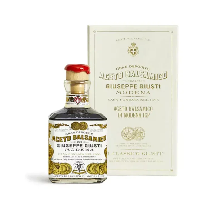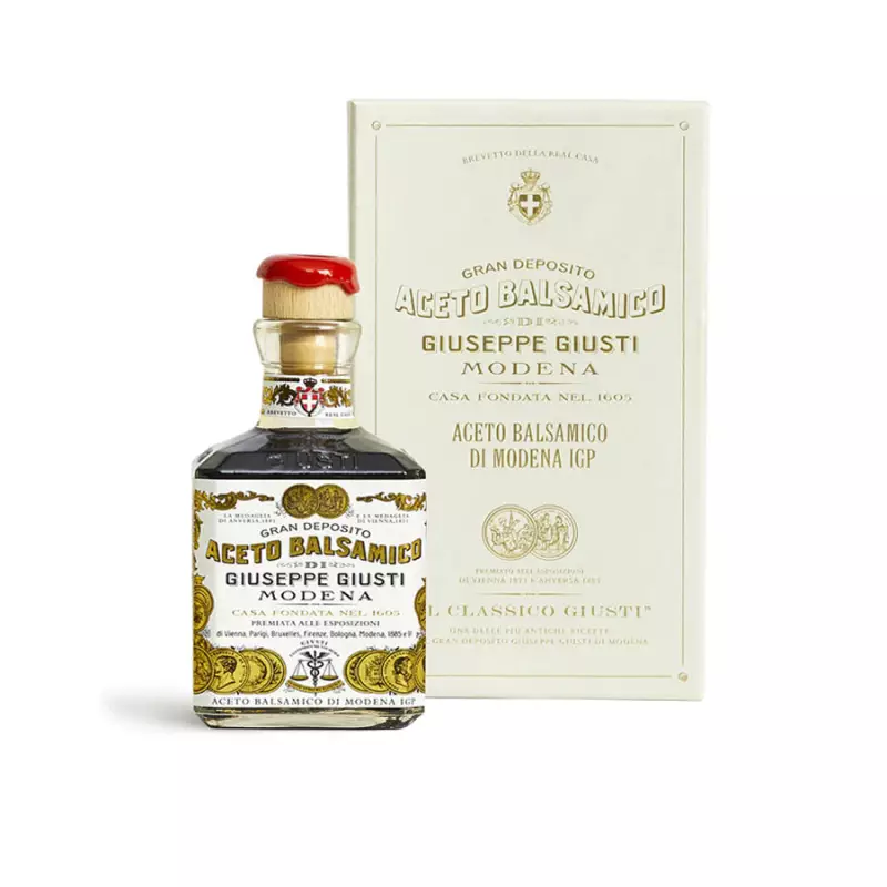 Balsamic Vinegar of Modena IGP 2 Gold Medals Giusti in a cubic bottle is perfect as a gift idea for any occasion thanks to the elegant white and gold case in which it is enclosed. This highly versatile balsamic, a historic product of the Giusti vinegar works, is suitable for both cooking and raw use and boasts good density and an excellent sweet-sour balance. With hints of ripe fruit and notes of liquorice and black pepper, it is aged in barriques with the addition of already-aged balsamic vinegar taken from centuries-old barrels.