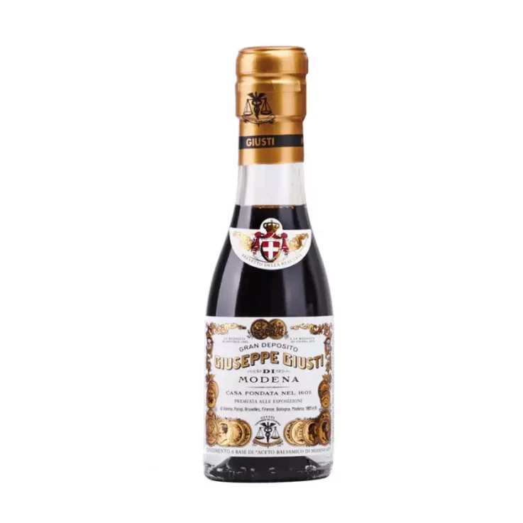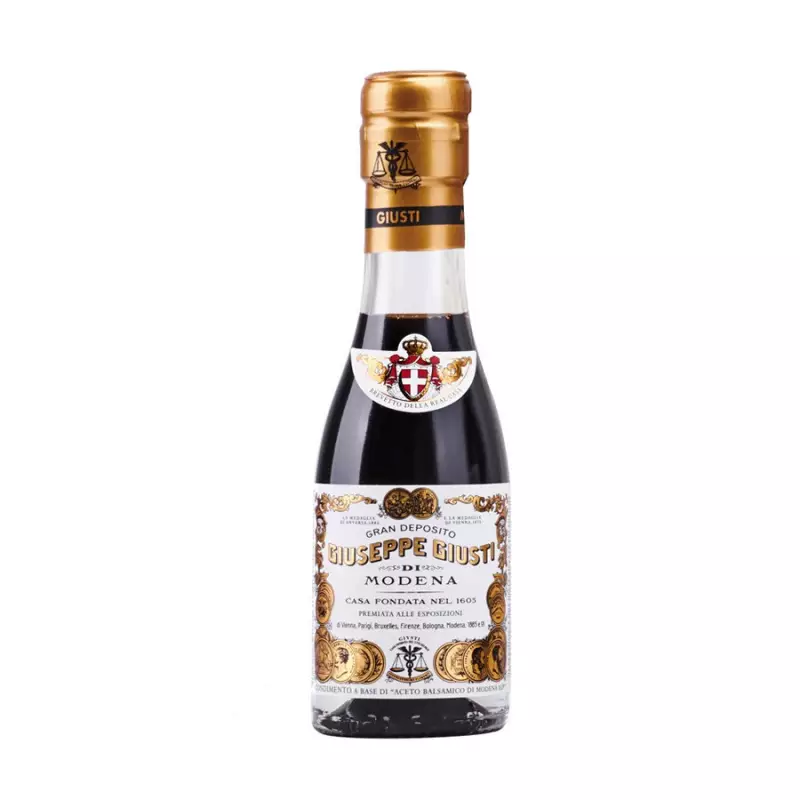 A classic for the Giusti family, this Balsamic vinegar of Modena PGI 2 Gold Medals is a greatly versatile balsamic, used both fresh or heated. With a good density and optimal balance between the sweet and sour, it is characterized by overtones of mature fruits, licorice and black pepper. This vinegar is aging in oak barrels, with the addition of aged balsamic vinegar extracted from centuries old casks Ingredients are must of cooked grapes and aged wine vinegar.