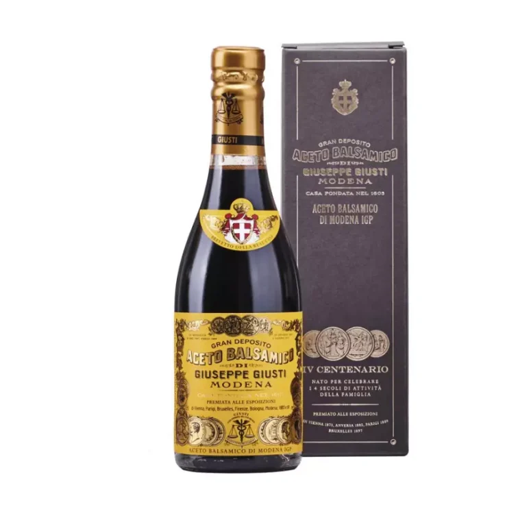 Born to celebrate the 400 years of Giusti family production, this balsamic vinegar of Modena PGI 4 Gold Medals (the “Quarto Centenario”) is a balsamic of extreme body and density, deeply aromatic, with scents of ripe fruits, accompanied by notes of tobacco, roasted coffee and hints of wood, thanks to its long aging. Aging: In series of antique small casks, dating back to the 1800‘s. Extracted once a year in a limited quantity. Ingredients: Must of cooked grapes, aged wine vinegar.