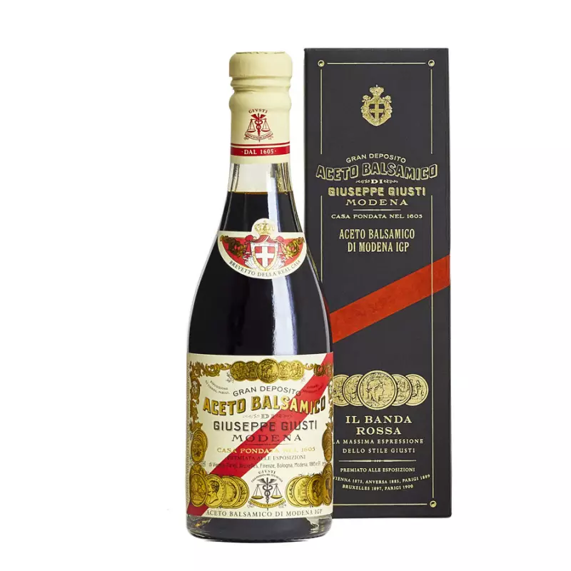 The ultimate pride and expression of the art of Giusti vinegars, this balsamic vinegar of Modena PGI 5 Gold Medals (the “Banda Rossa”) was the personal gift from Uncle Giuseppe to family members.