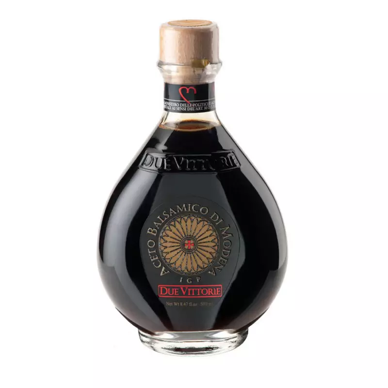Aceto Balsamico di Modena IGP Due Vittorie Oro Balsamic Vinegar in 500 ml bottle is distinguished by its density, sweetness and sugary body. It spends a good part of its life in oak barrels that promote the release of tannins and the intake of wood essences. Before bottling, it undergoes rigorous laboratory testing to ensure its compliance with current regulations and high quality. The black cherry aftertaste completes the fragrant and pleasantly bittersweet sensory profile. This very sweetness makes it perfect for multiple pairings in the kitchen, from appetizers to cheeses to fruit and desserts.