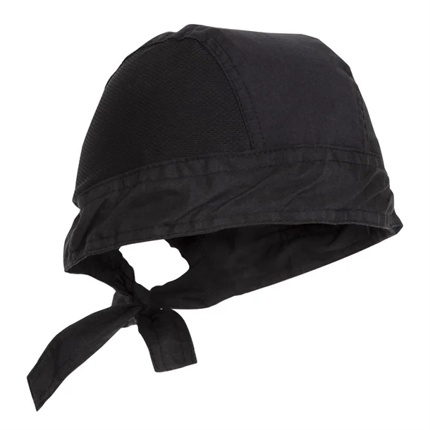 Modernisez votre uniforme et gardez le personnel au frais avec ce bandana de chef noir. Grâce à ses panneaux absorbants, le bandana permet de garder la tête sans sueur ni condensation. Non seulement cela aide à maintenir un excellent confort, mais aussi à éviter que les liquides ne tombent dans les aliments et les boissons.