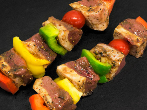 Brochettes montées à la main avec les magrets du canard, des poivrons de différentes couleurs et une tomate cerise, elles sont enrobées d’une marinade trois poivres. Faire cuire les brochettes au four, à la poêle ou au barbecue.
