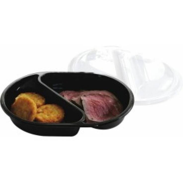 Barquette plastique CPET 2 compartiments noire avec couvercle spécial four 900 ml – par 40