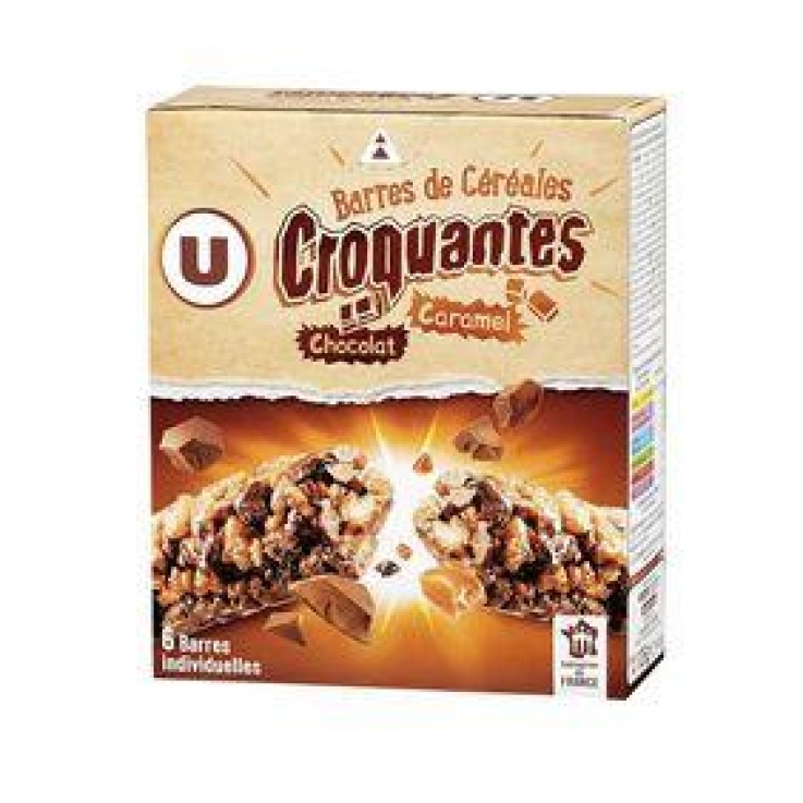 Céréales 48% [céréales croustillantes au caramel 24% (farine de riz, sucre, farine de maïs, farine de BLÉ, caramel au LAIT 1,2% (sirop de glucose-fructose, sucre, LAIT concentré sucré, arôme), amidon de BLÉ, sirop de glucose, caramel 0,4% (sucre, eau), extrait de malt d’ORGE, sel, arômes), céréales croustillantes chocolatées 24% (farine de BLÉ, chocolat 3,8% (pâte de cacao, sucre, cacao maigre en poudre), sucre, farine de riz, farine d’AVOINE, extrait de malt d’ORGE, sel)], sirop de glucose, chocolat au LAIT 18% (sucre, beurre de cacao, pâte de cacao, LAIT écrémé en poudre, matière grasse LAITIÈRE, LAIT entier en poudre, arôme, émulsifiant: lécithines de SOJA), huile de tournesol, caramel 3% (sucre, BEURRE, huile de palme, LAIT entier en poudre, LAIT écrémé en poudre, sel, émulsifiant: lécithines de SOJA), stabilisant: sorbitols, caramel aromatique (sirop de glucose, eau, sucre), arôme, émulsifiant: lécithines de SOJA, antioxydant: extrait riche en tocophérols. Certains ingrédients de ce produit ne proviennent pas de France. Traces éventuelles d’arachides et fruits à coque.