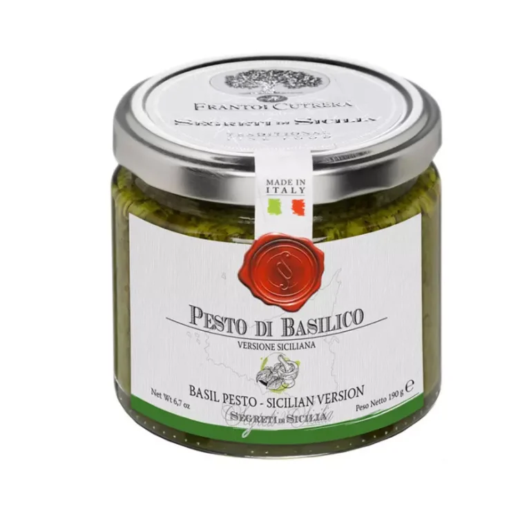 The Basil Pesto Sicilian Version Segreti di Sicilia is a reinterpretation of the typical Genoese pesto but with the use of Sicilian ingredients. Almonds and pistachios instead of pine nuts, “Cosacavaddu” cheese instead of Parmigiano Reggiano DOP, all enriched by Frantoi Cutrera Extra Virgin Olive Oil. A fresh and decisive scent, for a pesto with an intense and traditional character. Excellent as an appetizer on bruschetta or crostone, to season first courses but also on pizzas and savory pies.