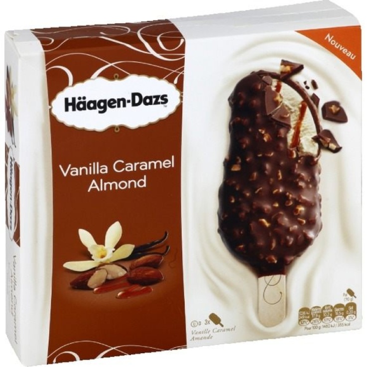 Crème glacée vanille avec sauce au caramel (10%) et amandes grillées (5%), chocolat de couverture (21%).