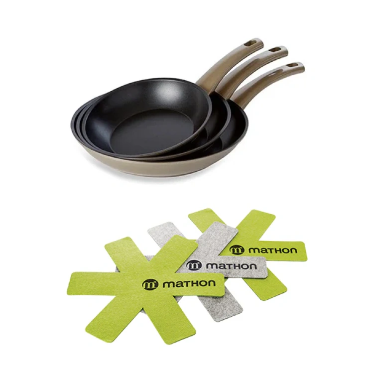 Batterie de cuisine poêles anti-adhérentes Prestige doré 20, 24 et 28 cm et 3 feutrines Mathon