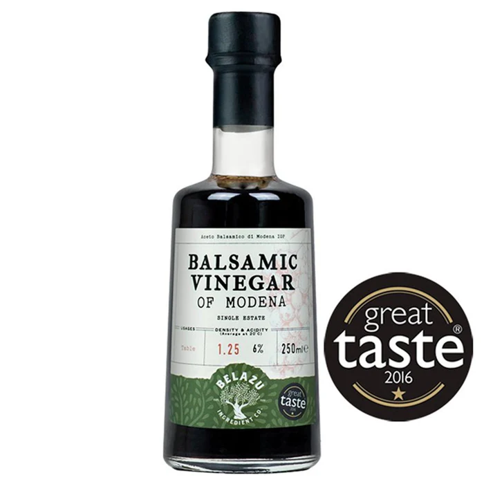 Bold, fruity and smooth with a pleasant acetic finish. This sweet and tangy Balsamic Vinegar of Modena enhances dressings, marinades and sauces. A mixture of grape must and wine vinegar is left to mature in wooden barrels in the same way as our 1.34. However, as our 1.25 spends less time maturing in barrels, the result is less dense, more fluid and full of tangy flavor. Great Taste 2016, Aceto Balsamico di Modena IGP, Single State.