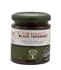 The Belazu black tapenade is made from olives that are hand-picked in Morocco for their quality, colour and shape. The olives are roughly chopped and mixed with sundried tomatoes and other sun-ripened Mediterranean ingredients for a delicious, intense flavour. Spread on bread, crostini or crackers and drizzle with Belazu balsamic vinegar Spoon into pasta and drizzle with oil and parmesan, for a speedy supper