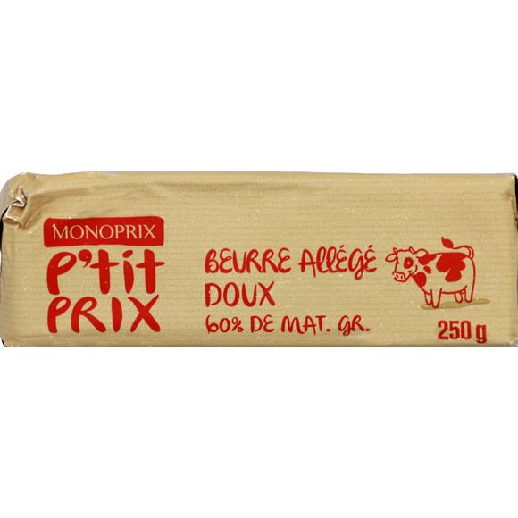 Beurre doux à teneur réduite en matières grasses 60% de matières grasses Pays de fabrication : FRANCE DLC minimum garantie: 7 jours Monoprix Exploitation Monoprix Exploitation 92116 Clichy Cedex