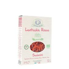 Bio Sedanini Lenticchie Rosse pâtes de farine de lentilles sans gluten à base de lentilles rouges biologiques cultivées en Italie 2 50g dans une boîte en carton –  Rustichella d’Abruzzo.