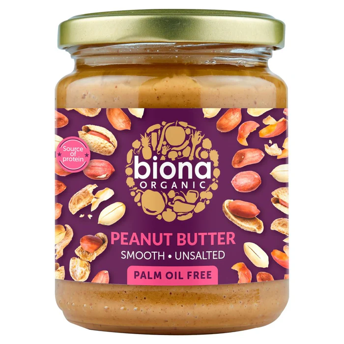Biona organic peanut butter is made using nuts, which are freshly roasted in small batches just before milling. Since we do not use palm fat or emulsifiers, the nut oil may separate – this does not affect the quality – simply mix back in to restore the creamy consistency. Organic, Palm oil free, Source of protein.