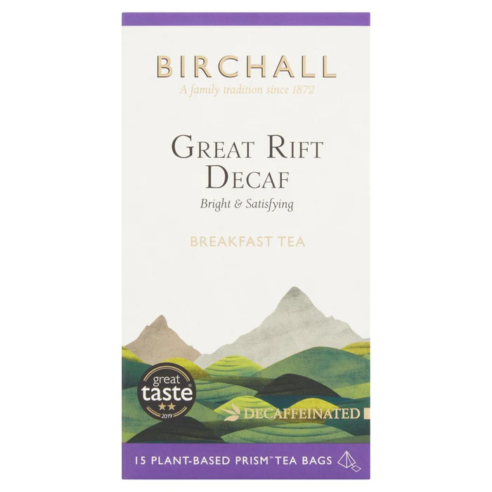 Birchall Great Rift Decaf is a decaffeinated* breakfast tea, expertly blended by the fifth generation of Birchall Graham’s family. In order to produce a cup of tea that is caffeine free, but bright and full of flavor, we have expertly sourced the finest selection of estate grown teas from across East Africa and the Great Rift Valley. Our pursuit of quality ensures that all our tea leaves are hand plucked before they are carefully decaffeinated and this gives Birchall Great Rift Decaf its exceptional brightness, golden color and strong refreshing taste. Our plant-based prism tea bags release the full flavor of our loose leaf tea and allow for the purest infusion. They’re made from biodegradable plant starch and are industrially compostable so please dispose of them in your food waste.