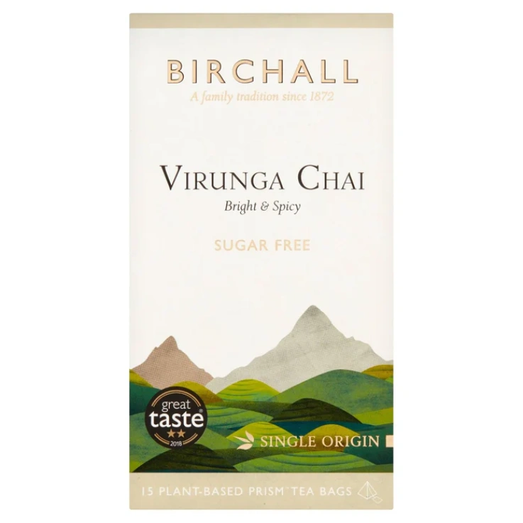 Our plant-based Prismâ„¢ Tea Bags release the full flavor of our loose leaf tea and allow for the purest infusion. They’re made from biodegradable plant starch and are industrially compostable so please dispose of them in your food waste. Birchall Virunga Chai is a powerful interpretation of a classic Indian tea, carefully crafted by the fifth generation of Birchall Graham’s family. Virunga Chai infuses the brightness and vitality of a supreme African black tea, grown close to Virunga National Park, with an eclectic blend of herbs and spices. Our pursuit of quality ensures we have expertly matched our exceptional broken black tea with the subtle sweet spices of cinnamon and cardamom and the warming flavors of ginger and red rooibos from South Africa. The unique result is a vibrant and uplifting blend that will soothe and satisfy throughout the day. Bright & spicy, Great taste 2018, Single Origin, A rich, gratifying all day tea bursting with spicy flavors, Sugar Free.
