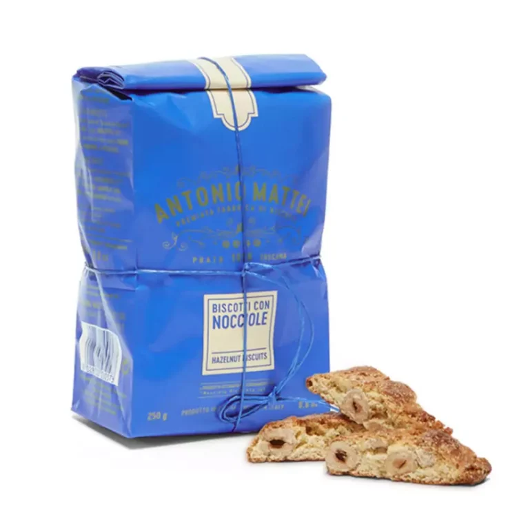 Biscuits with Piedmont PGI Hazelnuts by Antonio Mattei are a delicious taste variety of the classic Prato biscuits with almonds, also known as Cantucci or Cantuccini. They are part of the traditional Tuscan confectionery and they are perfect after a meal paired with Vin Santo wine. Cantucci biscuits with hazelnuts by Antonio Mattei are prepared with the same dough of classic biscuits. The recipe includes only 4 simple ingredients: flour, sugar, hazelnuts and free range eggs. They do not contain preservatives, animal fats or vegetable fats. Since 1858 Antonio Mattei Biscuits Cantuccini have been baked daily in the same rooms of the historic bakery and packed by hand in the classic and iconic Mattei Blue Bag. The production of biscuits with the famous Piedmont PGI Hazelnuts begun in 2019.
