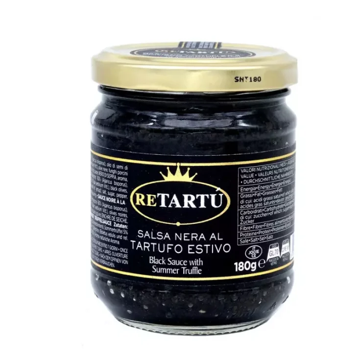 Giuliano Tartufi’s Black Truffle Sauce is a tasty sauce made from Champignons and porcini mushrooms, black olives and summer truffles (5%). A small amount of squid ink is added to make the colour even more intense. It is excellent for preparing hot canapés, for seasoning pasta, but also as an addition to the cooking sauce of roasts to enrich the flavour with the unique aroma of quality truffles.