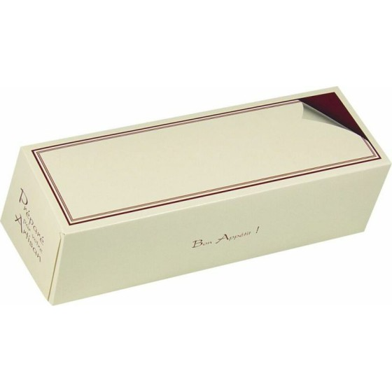 Les boites pâtissières longues de dimensions généreuses, 27 x 9 x 8 cm, sont conçues spécialement pour les professionnels des métiers de bouche, en particulier les boulangers, pâtissiers, et traiteurs. Fabriquées en carton d’une élégante couleur ivoire, des inscriptions et un liseré bordeaux viendront compléter son design. Ces boîtes pâtissières offrent bien plus qu’une simple solution d’emballage. Elles sont le choix idéal pour assurer protection, fraîcheur et une présentation attrayante de vos délicieuses créations.