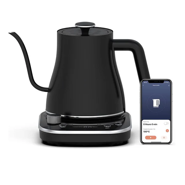 【Smart app Control】 prend en charge la connexion Bluetooth ou Wifi, plus stable et plus rapide que les bouilloires qui ne peuvent être connectées que par Bluetooth. Comme la portée n’est pas limitée par la distance, vous pouvez contrôler votre chaudière à col de cygne avec votre téléphone, travailler sur le chemin du retour ou du réveil et régler la température souhaitée (exactement à 1 ° c).【5 préréglages simples pour le contrôle de la chaleur】 Préparez votre café et votre thé comme un pro et utilisez une application pour régler la température exacte que vous souhaitez entre 38 ° C et 100 ° f. La fonction d’isolation thermique maintient automatiquement la température de l’eau pendant six heures complètes. La chaudière à col de cygne a une fonction supplémentaire qui permet de prendre rendez – vous pour faire bouillir l’eau de 1 à 12 heures.【cuisson rapide】 1200w chauffe rapidement 0,8l d’eau et ne prend que 3 à 5 minutes pour vous aider à profiter d’une tasse de café en peu de temps. Cette bouilloire sonne trois fois lorsque l’eau atteint une température prédéfinie. Vous pouvez également le désactiver sur l’application, ce qui permettra un mode silencieux.【Precision Casting】 la buse longue col de cygne dispose d’une buse puissante mais précise pour un taux de débordement optimal. La structure équilibrée de la chaudière et la poignée contrarotative assurent une prise stable et favorisent une coulée plus lente.【conçu pour le goût et la sécurité】 fabriqué en acier inoxydable de qualité alimentaire 304 avec capteur de température NTC, il s’éteint automatiquement dès que l’eau atteint la température souhaitée. L’eau sèche la