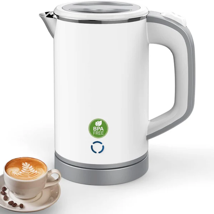 Conçu pour le voyage : avec seulement 14 x 10 x 18,5 cm, la mini bouilloire ne se démarque pas et peut être facilement rangée dans une valise, un sac à dos ou un sac. Grâce au traitement à double paroi, le corps chauffe beaucoup moins.Design réfléchi : grâce à son design compact et élégant, la bouilloire est petite. Mais d’autant plus impressionnantes sont ses valeurs intérieures : avec une capacité de 0,8 litre, la bouilloire peut faire bouillir assez d’eau en un tour de main, même pour de grands tours.Caractéristiques de confort : la bouilloire apporte confort et design à votre cuisine. Avec la puissante bouilloire en acier inoxydable, vous préparez du thé, du café, des soupes et bien plus encore. Particulièrement sûr grâce à la surface thermo-isolante Soft Touch et au boîtier intérieur en acier inoxydable de qualité alimentaire. Le design moderne de la cuisinière à eau en 3 couleurs différentes, que ce soit noir, blanc, s’adapte à toutes les cuisines et pièces.Sûr et durable : l’ensemble du boîtier intérieur de la bouilloire est en acier inoxydable SUS-304 de qualité alimentaire – Sans BPA et autres substances nocives pour la santé. Le design à double paroi et le revêtement spécial Soft Touch maintiennent le boîtier agréablement frais et l’eau chaude pendant longtemps. Étant donné que les éléments chauffants de la bouilloire sont cachés dans la gaine enacier inoxydable, la bouilloire est particulièrement facile à nettoyer.