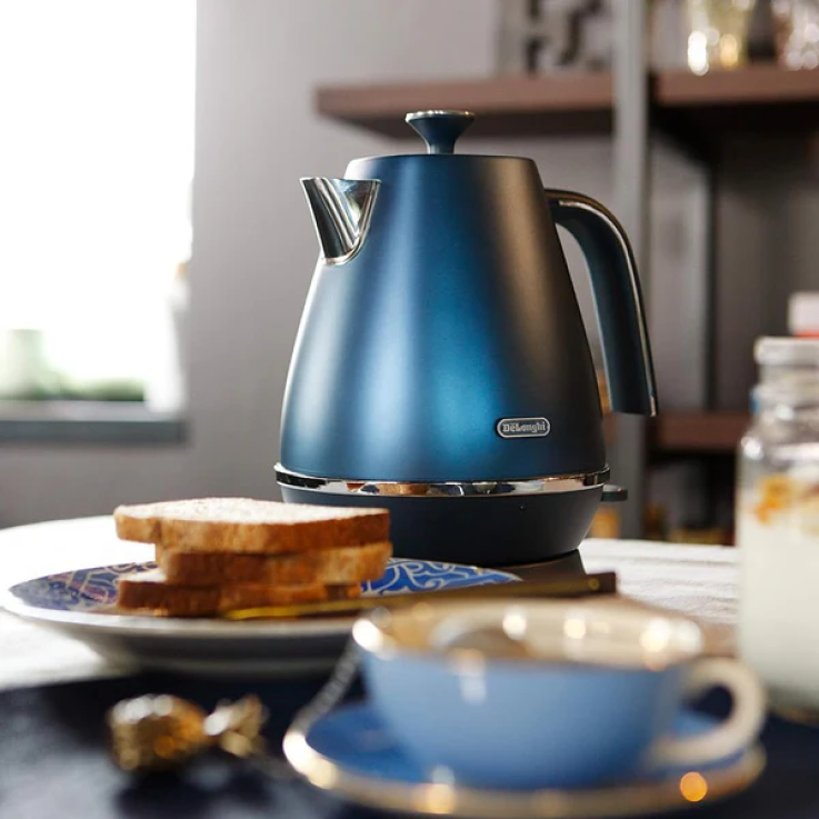 bouilloire électrique Delonghi avec un design élégent avec socle 360°.