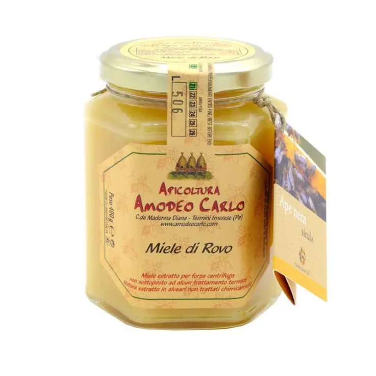 Amodeo Carlo’s Sicilian Black Bee Rove Honey is produced in the Palermo and Messina areas. It has an intense, almost caramel-like aroma and its flavour is strong, pleasant and rich in mineral salts. Its colour tends towards dark amber when it crystallises. It is ideal paired with fresh, unripened cheeses such as ricotta or first salts.
