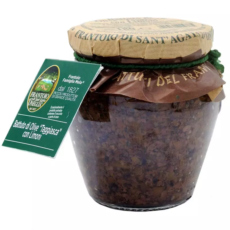 Bruschetta with Taggiasca olives and Lemon by Sant’Agata d’Oneglia is a real specialty of the company. Unlike the paté, in the preparation of Bruschetta mixture (“Battuto” in Italian) the olive is minced into slightly coarser pieces so that the consistency of the Taggiasca olive is clearly distinguishable both at the sight and when tasted. This mixture combines the sweetness of the Taggiasca olive with the fresh and genuine taste of lemon. For the preparation, in fact, real lemons are used without adding flavorings. Try it on toasted bread or as an accompanying sauce. The delicate taste of lemon enhances the flavor of the fish, creating a perfect base for tuna canapes and a delicious condiment for fish Pasta sauce.