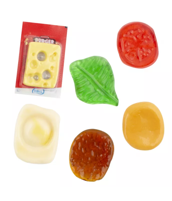 VIDAL – Confiserie lisse gélifiée saveur fraise qui forme un burger – Vendu en gros conditionnement dans un carton de présentation contenant 66 unités (11 planches de 6 unités).