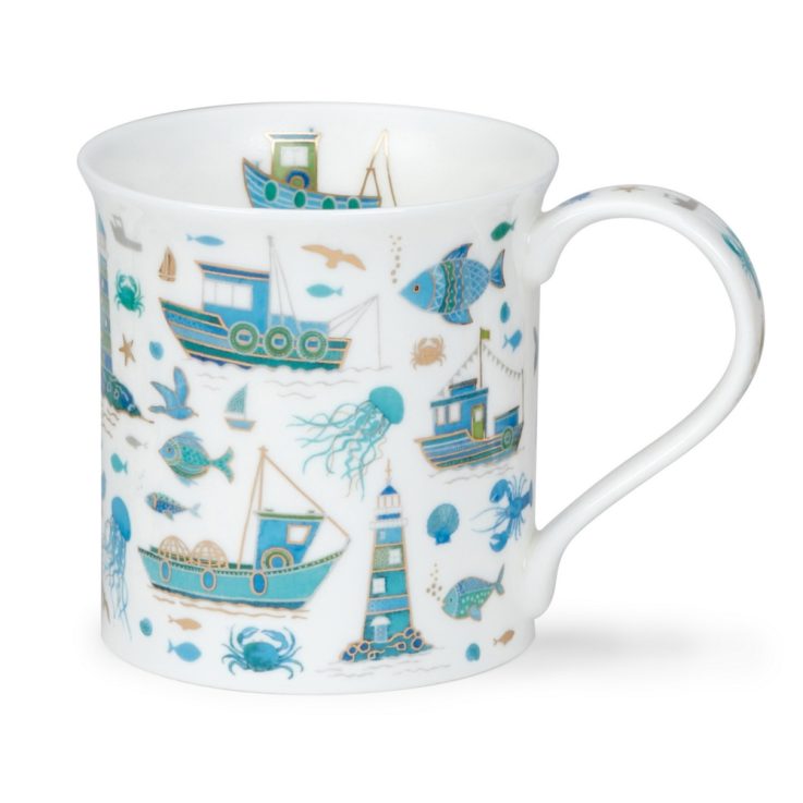Fishing boats, lighthouses and sea creatures in various shades of blue, jade and turquoise are detailed with 22 carat gold in this delicate seaside design